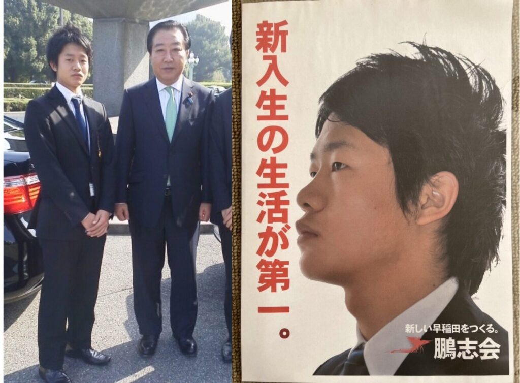 早稲田大学商学部に進学すると、政治サークル「早大鵬志会」に入会。