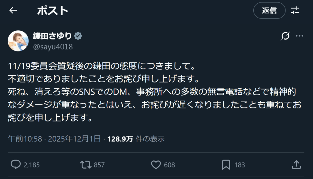 12/1に自身の今までの非礼な振る舞い等を謝罪する内容をXへ投稿しました。