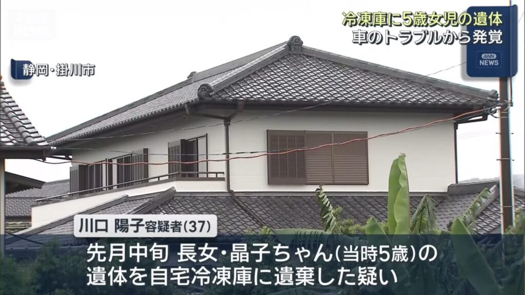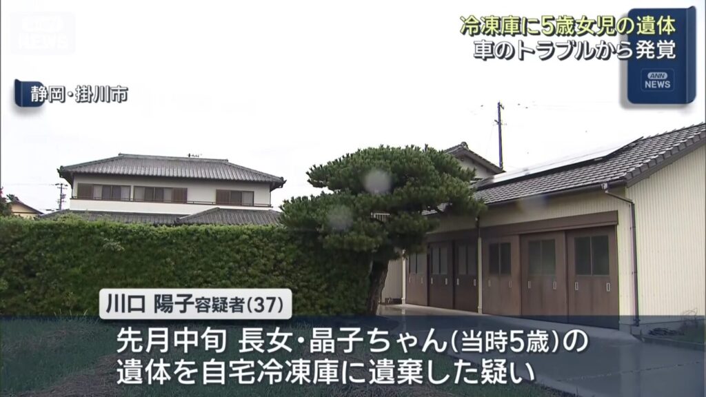 - 静岡県掛川市の無職、川口陽子容疑者(37)が、5歳の長女・晶子ちゃんの遺体を自宅の冷凍庫に遺棄したとして、死体遺棄の疑いで逮捕・送検された。