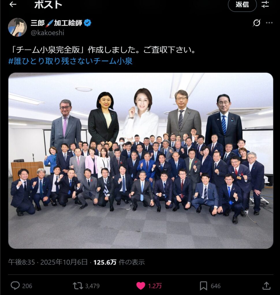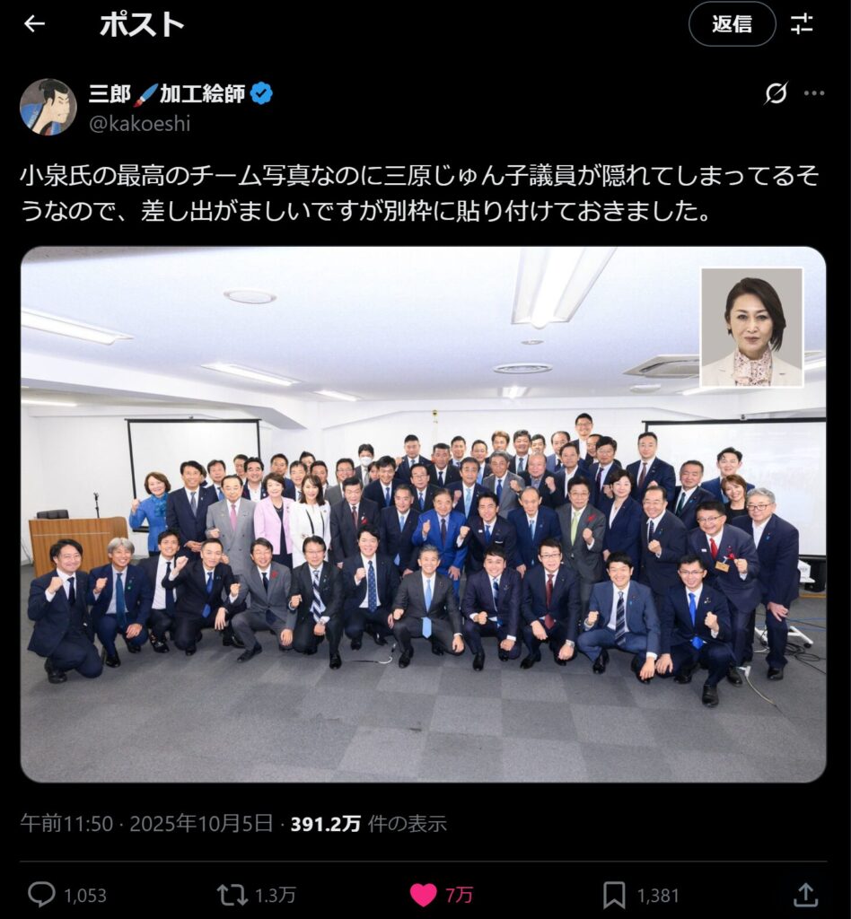 - 自民党総裁選で敗北した小泉進次郎氏がSNSに投稿した陣営の集合写真で、三原じゅん子氏が他の議員の陰に隠れ、顔が写らないようにしていたことが話題になりました。