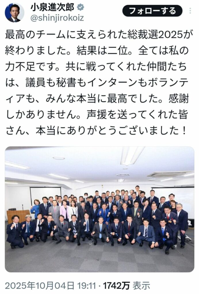 総裁選後、小泉氏は自身のXを更新して結果を報告、その際に添付されていた1枚の写真が物議を醸しています。