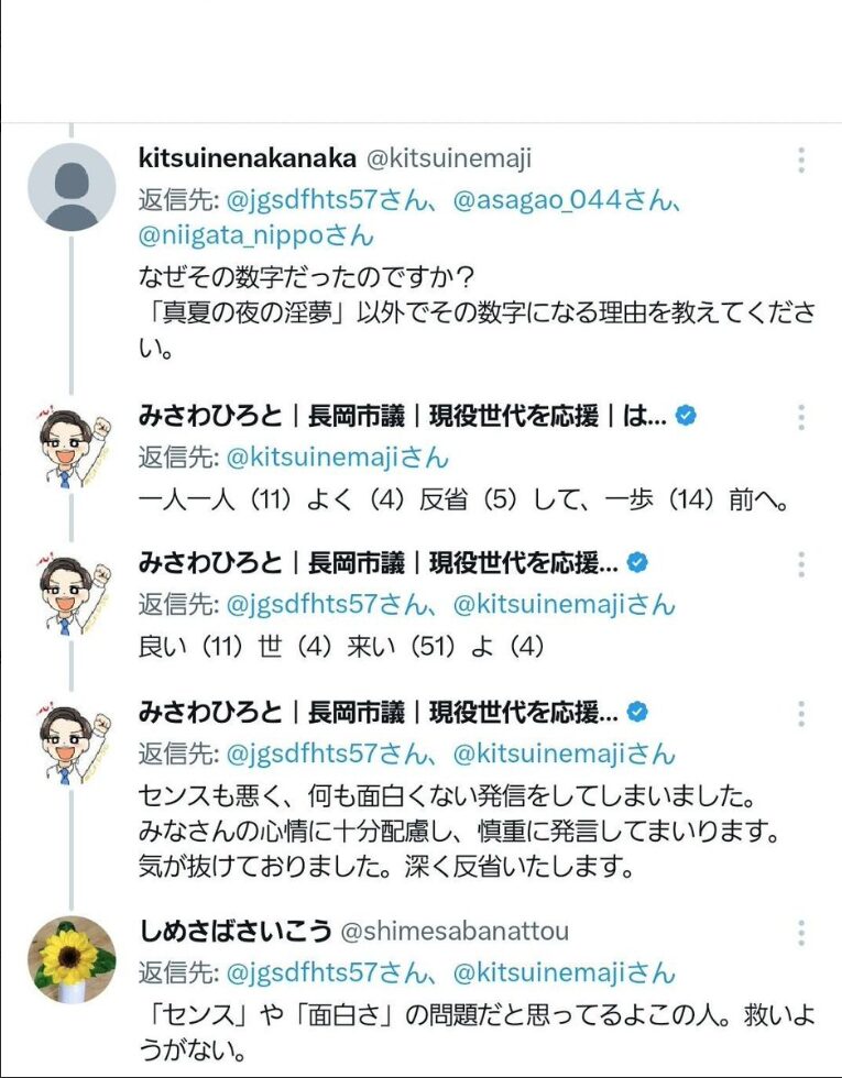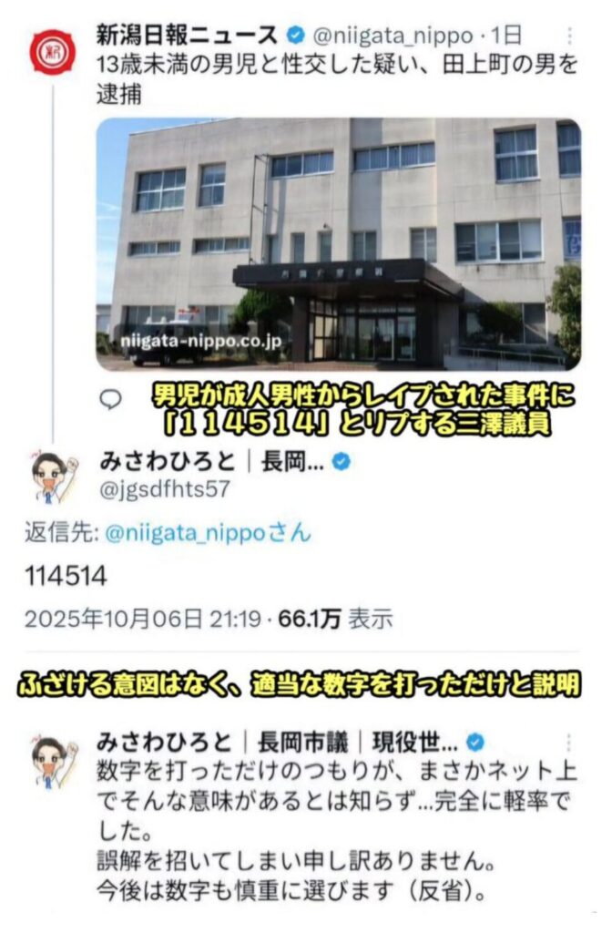 その事件に対し、長岡市議会議員が不適切な投稿を行いました。