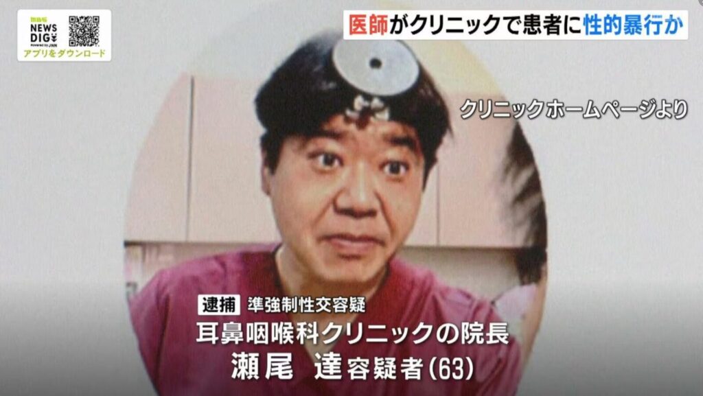- 兵庫県尼崎市の耳鼻咽喉科クリニック院長、瀬尾達容疑者(63)が逮捕されました。