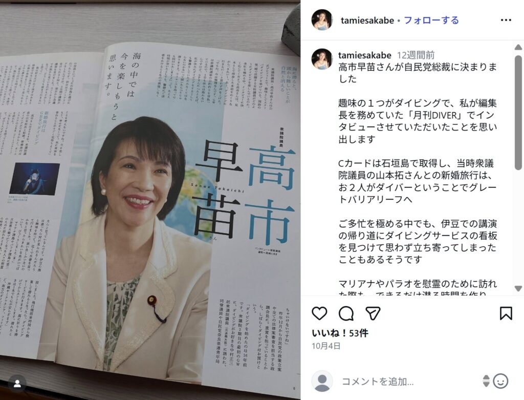 • 高市氏は趣味がスキューバダイビングであることを公言しており、潜水士の免許も所持しています。
