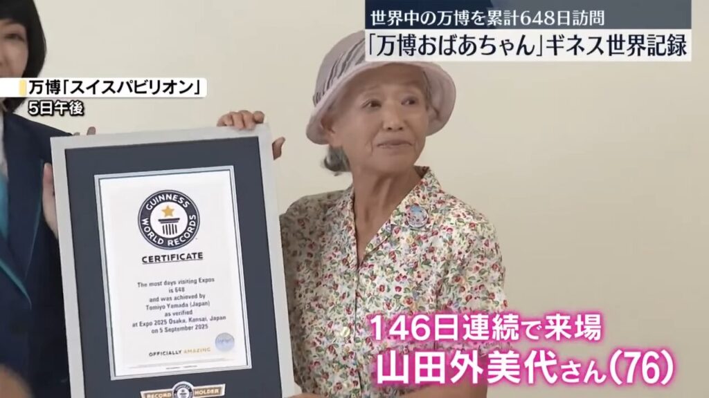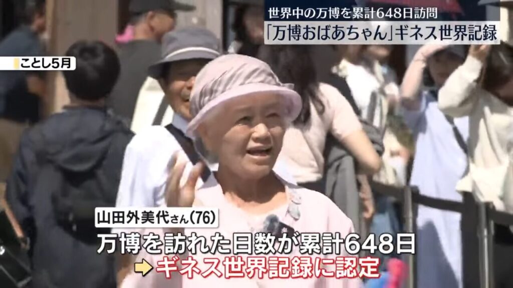 愛知県在住の山田外美代さん(76歳)が、これまでの万博訪問日数が合計648日となり、「万博を訪れた最多日数」でギネス世界記録に認定されました。